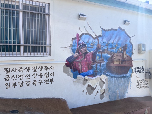 근처에 벽화마을이 있다길래 또 있다면 가야지 하는 마음으로 설렁설렁 걸어서 갔다. 날씨도 따뜻하고 바다도 예쁘고 걷는데 기분이 좋았다..걱정 없이 이런 시간만 가득하면 좋겠다고 생각했다. 걷는데 뭔지는 모르겠지만 이순신 관련 유적이 있었고 벽화도 이순신이었다.