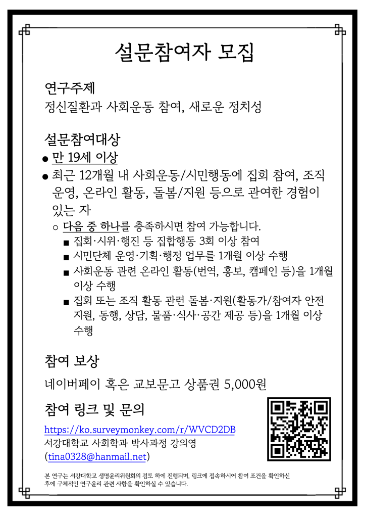 안녕하세요? 저는 서강대학교 사회학과 박사과정 강의영이라고 합니다. 사회운동과 정신질환 경험에 관한 다음과 같은 설문을 하고 있습니다. 아래와 같은 조건을 충족하실 경우 참여 가능합니다.